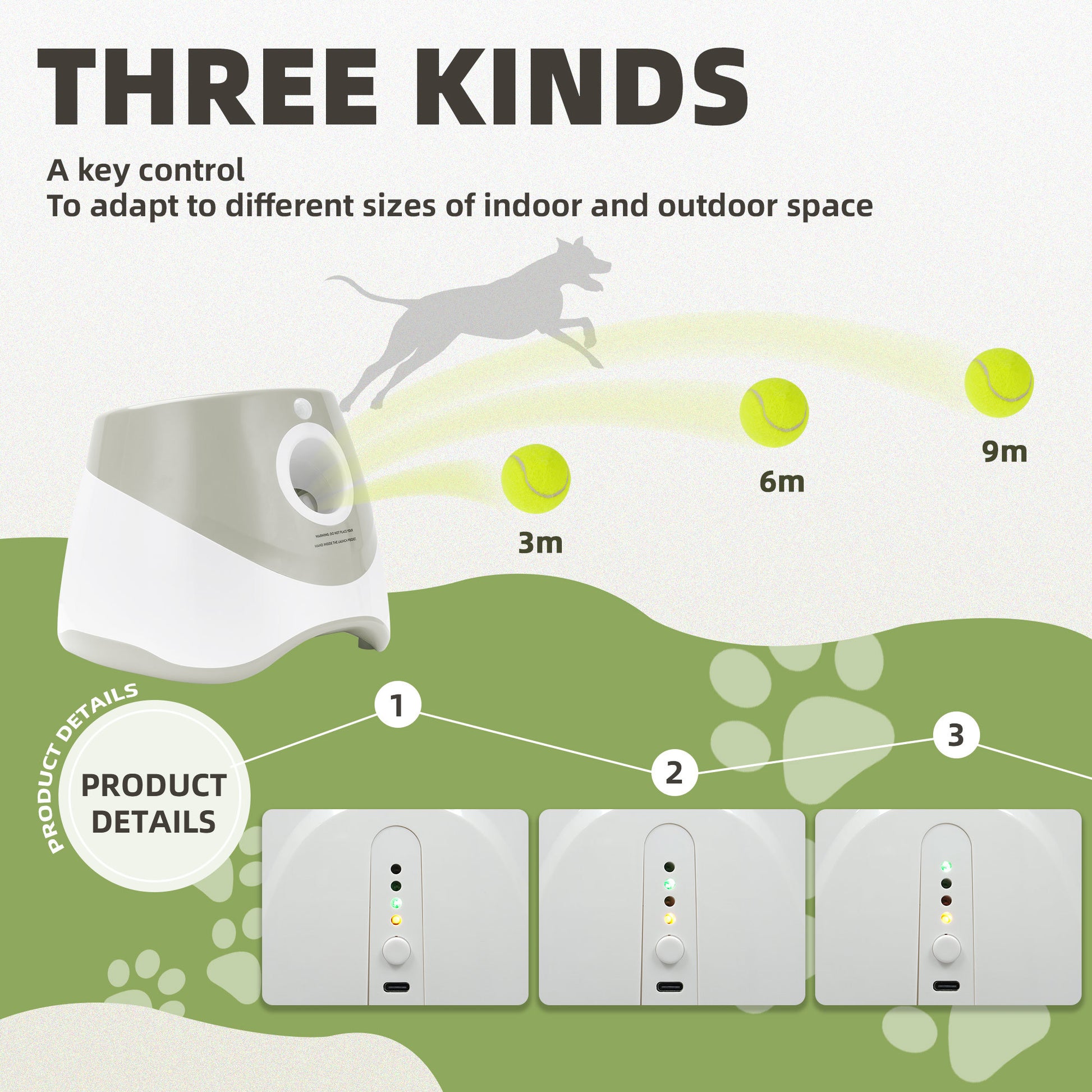 - THREE RANGE MODES: The automatic dog ball launcher is adjustable in three modes with one click, easily realizing different throwing distances and providing different game experiences for your pet.